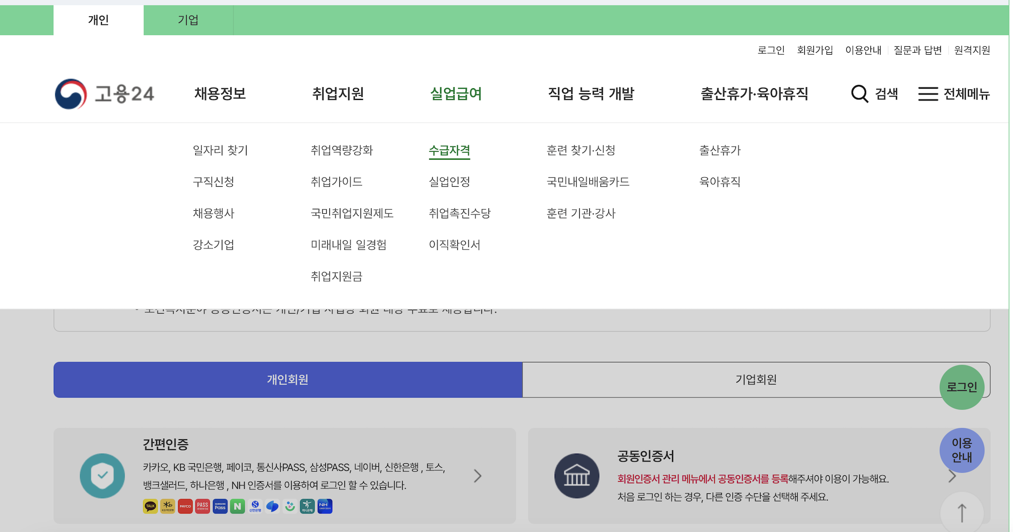 상단 실업급여 메뉴에서 수급자격을 클릭합니다.