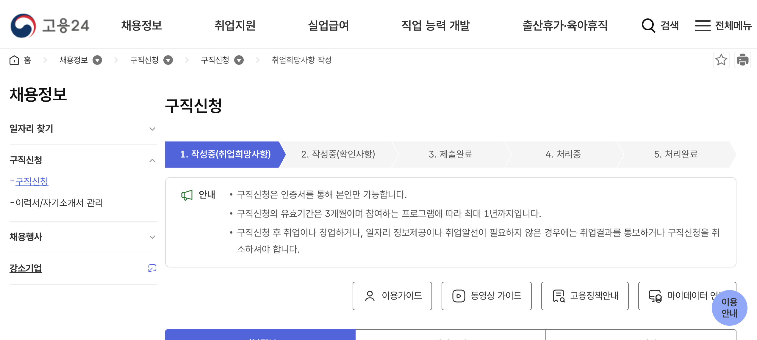 작성 시, 직업 종류와 희망 직종을 선택하게 되는데 구체적인 작성 보다는 넓은 범위의 직군으로 작성하는 것이 좋습니다. (ex.서비스직, 사무직 등)