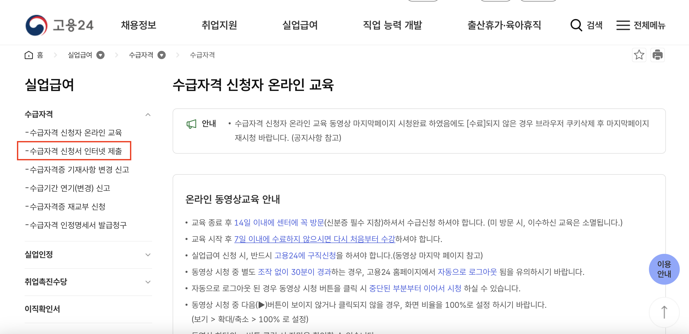 • 수급자격 신청자 온라인 교육: 고용노동부의 고용24 사이트에서 시청할 수 있습니다.