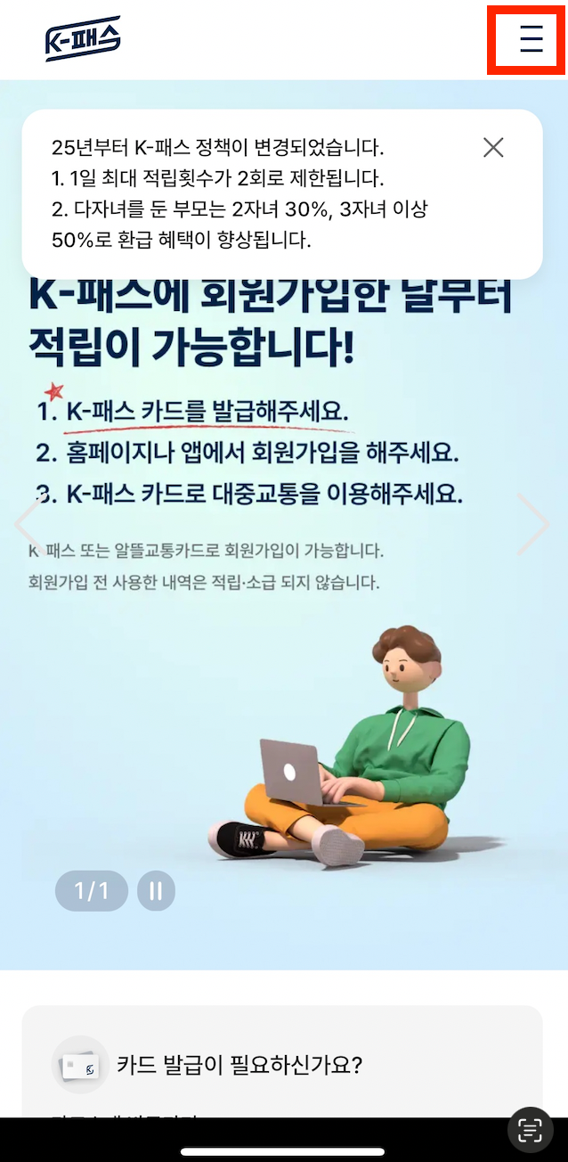 카드를 발급 받았다면, K-패스 앱을 통해 회원가입을 진행합니다.