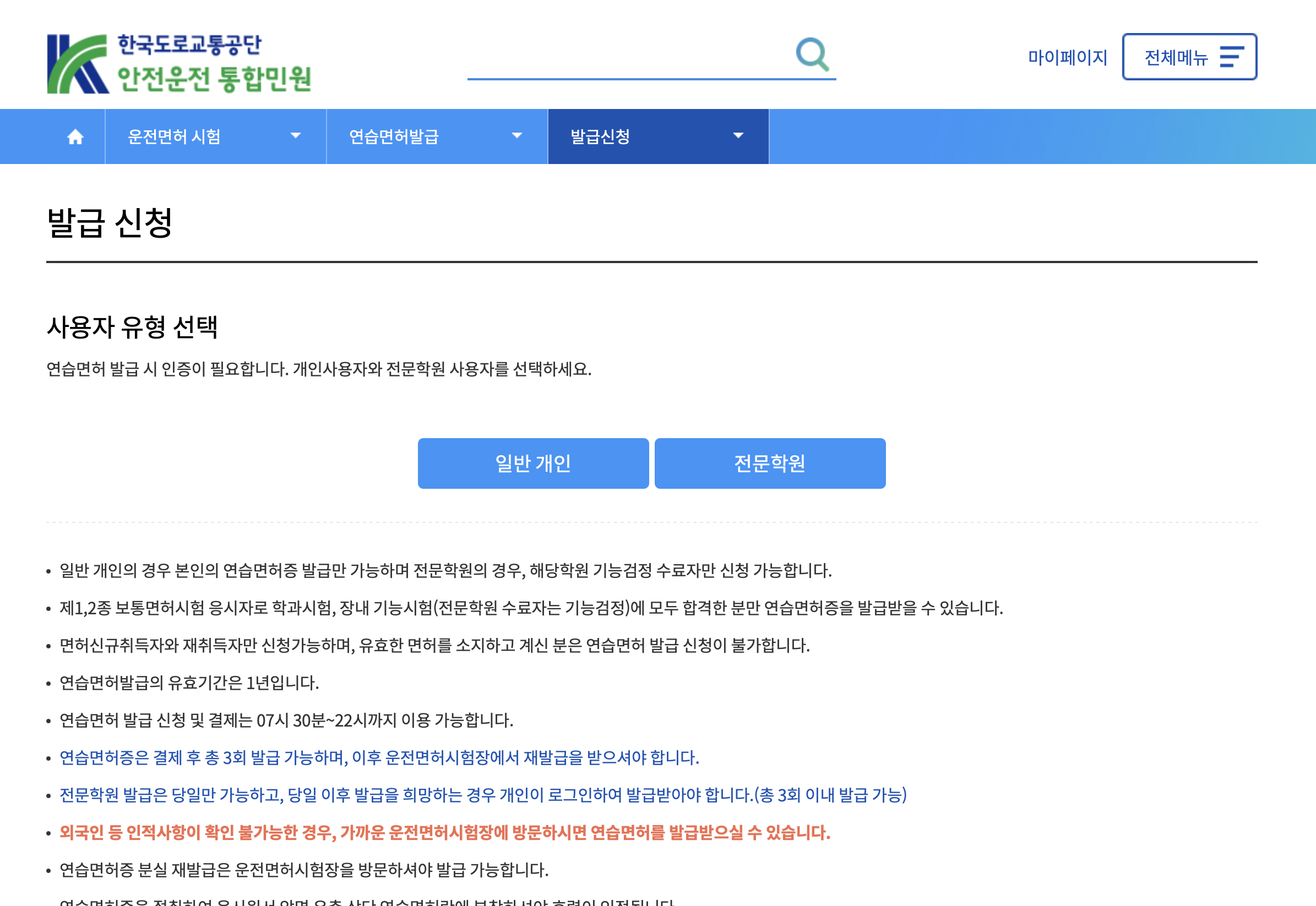 '한국도로교통공단 안전운전통합민원' 사이트에 접속 > 연습면허발급 > 발급신청