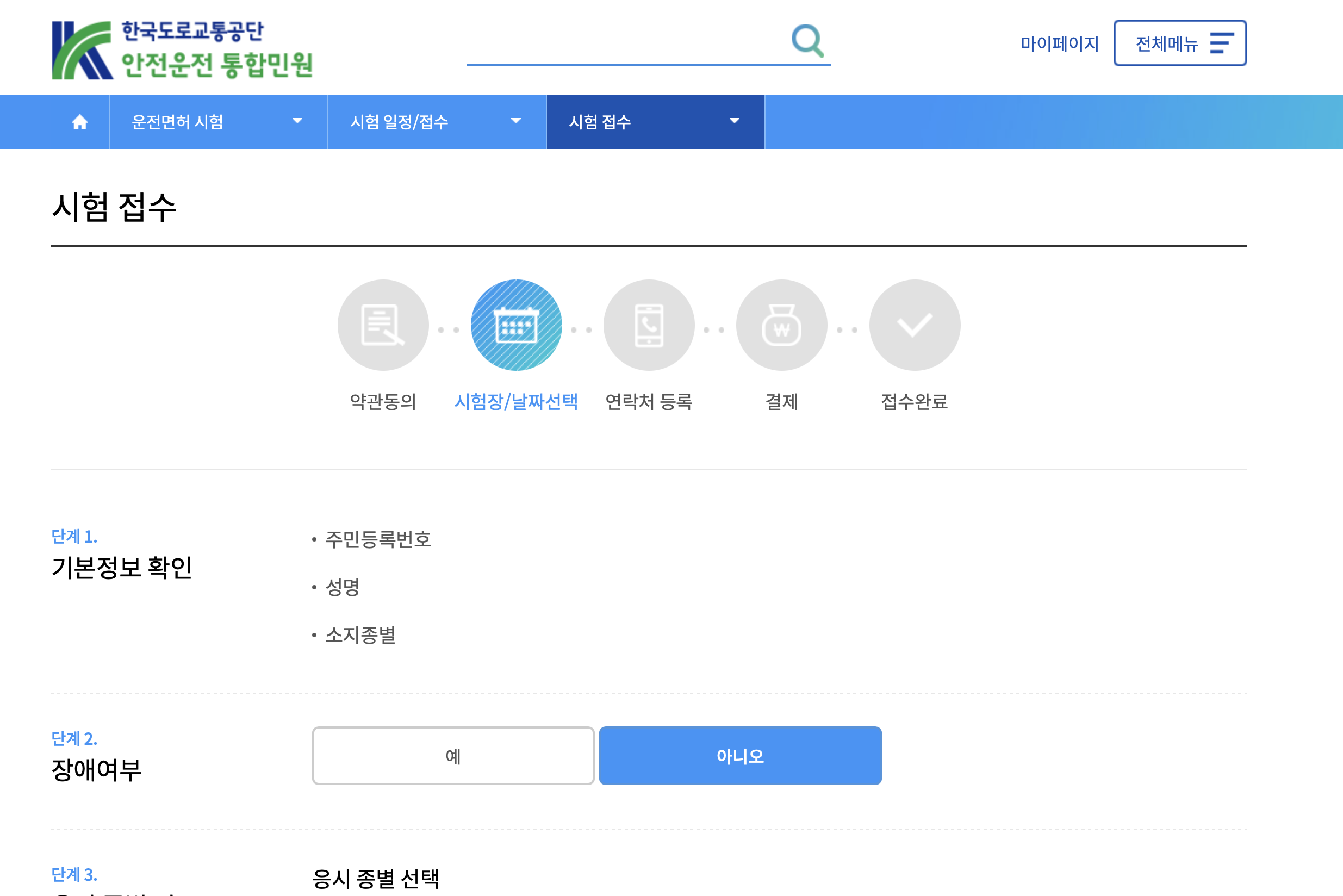 '한국도로교통공단 안전운전통합민원' 사이트에 접속 > 시험 일정/접수 > '시험장 및 날짜' 선택 > 접수진행