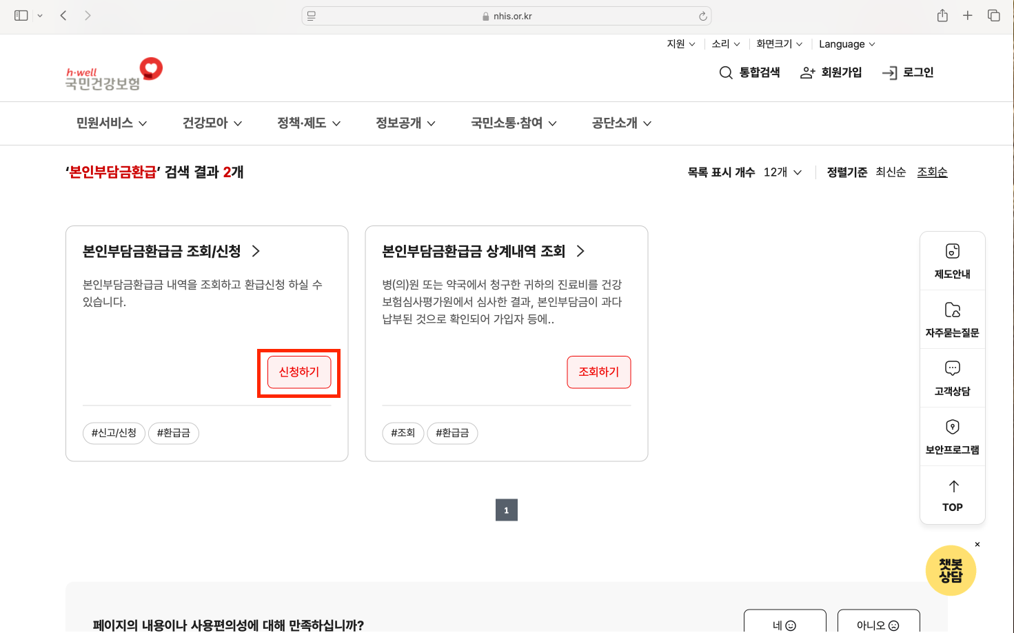 (2) 키워드란에 '본인부담금환급' 입력 > 검색