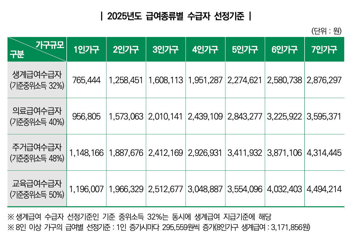 가구의 소득인정액은 "가구규모별·급여종류별 선정기준"과 비교하여 급여종류별로 수급자 선정 및 생계·주거급여액 결정이 결정됩니다.